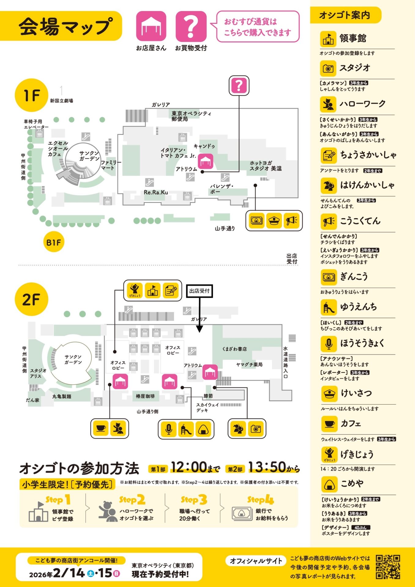 - その他 デザイナー、モデル、お針子、旗屋、司会者、保育士、カメラマン、カフェ、派遣会社などのオシゴトがある場合もあります。オシゴトの種類と場所と内容は会場で当日配布されるチラシでご確認ください。